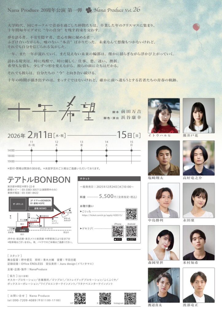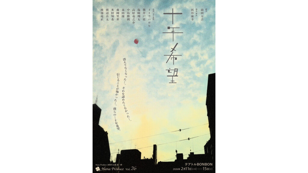 【森岡里世】 2025年12月21日 最終更新日時 : 2026年1月6日 straydog Nana Produce vol.25『十年希望』に、【森岡里世】が出演いたします! 【劇場】テアトルBONBON 【日程】2026年2月11日(水・祝)~15日(日) 公式HP ご予約はこちらから